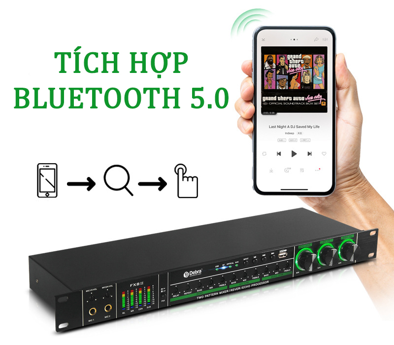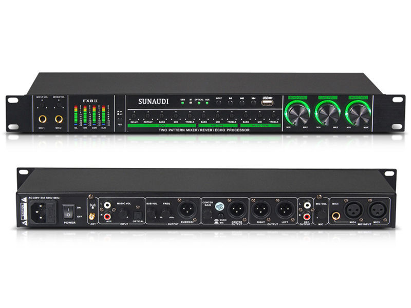 Mặt sau Vang Cơ Sunaudi FX8II là các cổng kết nối phong phú bao gồm: cổng nguồn chống giật, cổng kết nối loa sub, nút chỉnh cắt sub, cổng kết nối loa center, đầu vào micro, Optical... để bạn có thể lựa chọn và kết nối với thiết bị khác một cách nhanh chóng, dễ dàng và thuận tiện nhất. Hơn thế nữa, Sunaudi FX8II là chiếc vang cơ có hỗ trợ kết nối không dây Bluetooth 5.0 cùng mạch đọc USB giải mã MP3 cao cấp với tốc độ truyền dẫn tín hiệu nhanh, ổn định, có thể sử dụng nguồn nhạc từ các thiết bị di động như smartphone, laptop, Tivi,...