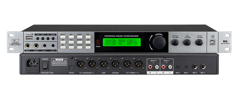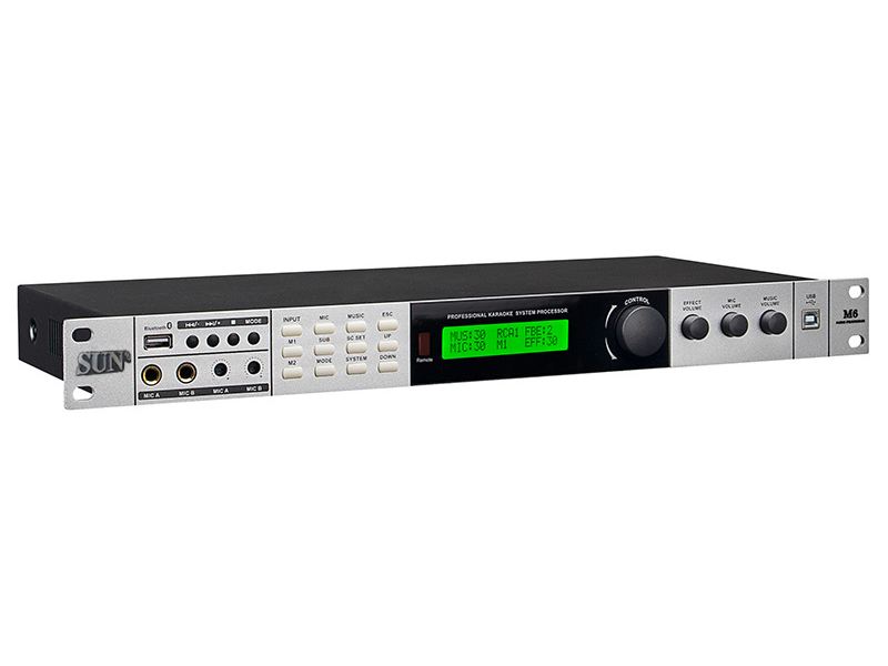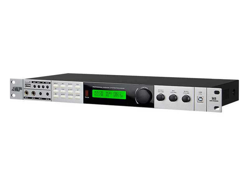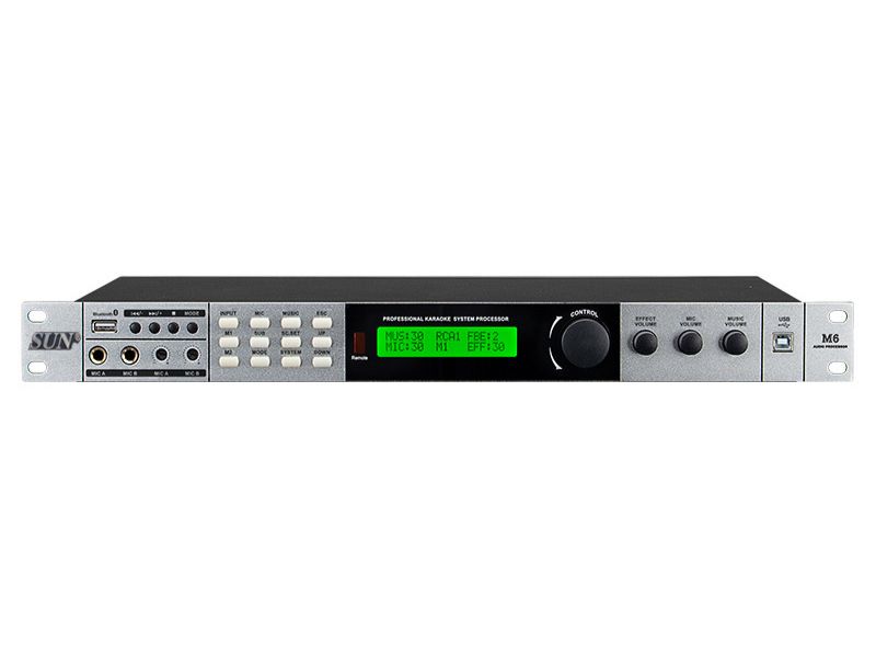 Nổi bật ở mặt trước Sunaudi M6 là màn hình LCD hiển thị trạng thái, thông số hoạt động, bên cạnh đó vẫn có đầy đủ các nút hiệu chỉnh cơ bản của một chiếc vang số chuyên nghiệp và 3 núm vặn cỡ lớn EFFECT, MUSIC, MIC. Mặt sau là nơi đặt các cổng kết nối thông dụng như Canon, AV, Optical, Micro, nguồn điện,… với chú thích rõ ràng, hỗ trợ tối đa cho người dùng trong quá trình phối ghép với các thiết bị khác.