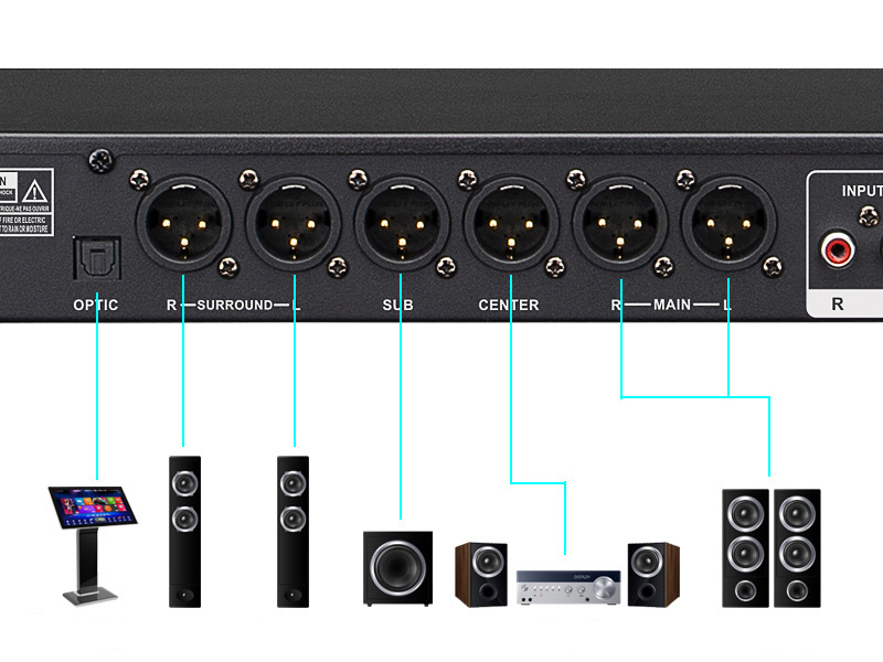 - Kết nối đầu ra: Main L/R, CENTER, SUB, SURROUND