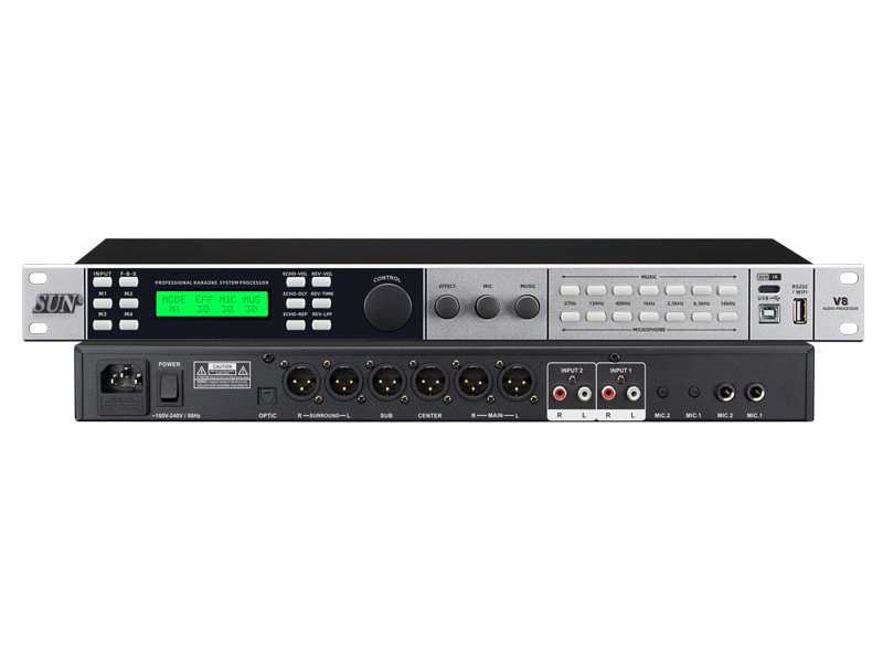 Nổi bật ở mặt trước Sunaudi V8 là màn hình LCD hiển thị trạng thái, thông số hoạt động, bên cạnh đó vẫn có đầy đủ các nút hiệu chỉnh cơ bản của một chiếc vang số chuyên nghiệp và 3 núm vặn cỡ lớn EFFECT, MUSIC, MIC. Mặt sau là nơi đặt các cổng kết nối thông dụng như Canon, AV, Optical, Micro, nguồn điện,… với chú thích rõ ràng, hỗ trợ tối đa cho người dùng trong quá trình phối ghép với các thiết bị khác.