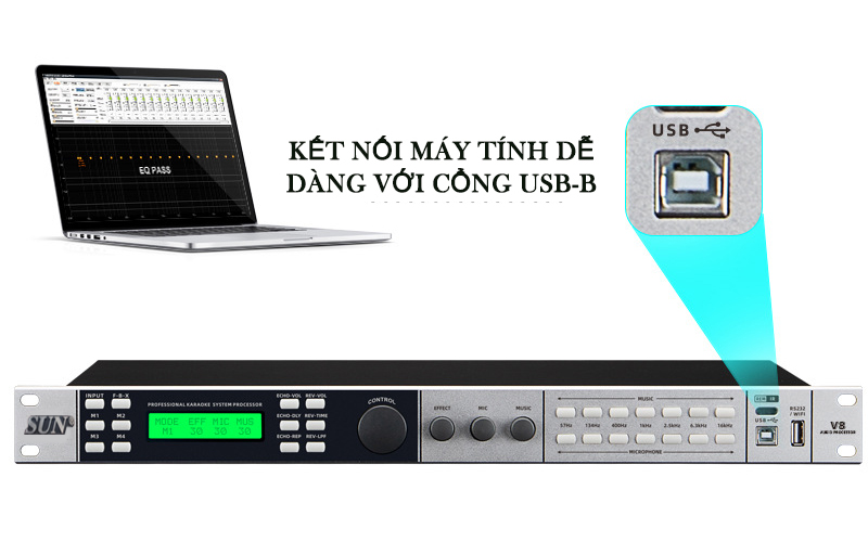 Sunaudi V8 được trang bị đến 4 cổng micro với điều khiển khuếch đại độc lập, bạn có thể điều chỉnh âm thanh nổi, đơn âm hay các thông số độ trễ, lặp lại với PEQ cho âm thanh được chi tiết và mượt mà, thanh thoát nhất. Đồng thời điều chỉnh và lưu lại các thông số kỹ thuật phù hợp với giọng hát, thể loại nhạc theo ý thích của bạn.