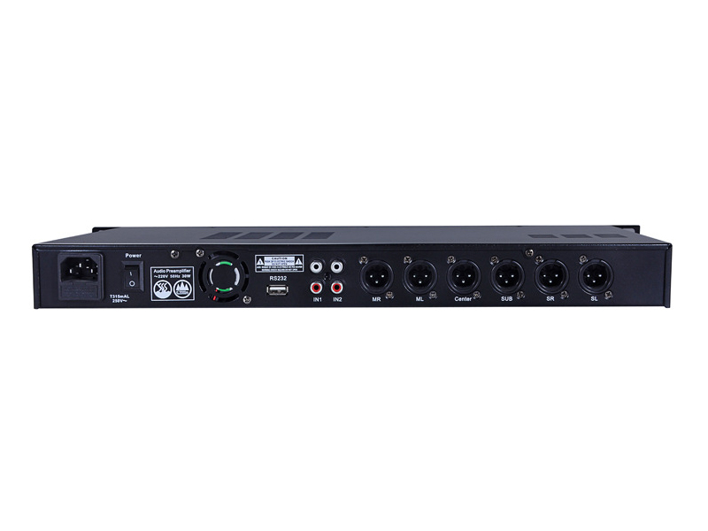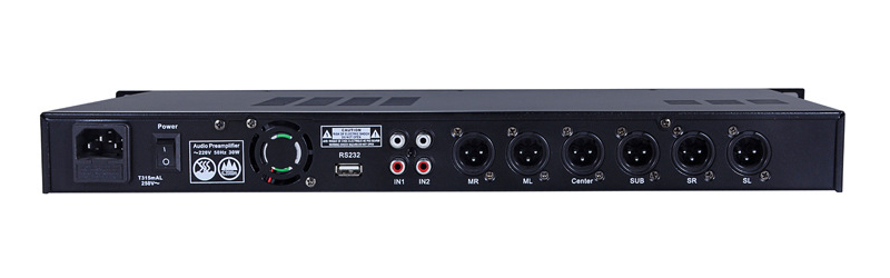Mặt trước thiết kế bao gồm các màn hình LCD, chỉnh bằng tay các nút music, mic, effect, nút tổng control, 3 cổng micro 6 ly... đầy đủ chú thích rõ ràng. Mặt sau là các nguồn nhạc vào cắm RCA, Ngõ vào Input và Onput, ngõ kết nối nguồn điện, 4 đường tín hiệu ra loa, MR, ML, SR, SL, 1 ngõ ra CENTER, 1 ngõ ra SUB, công tắc tắt mở nguồn thiết bị.