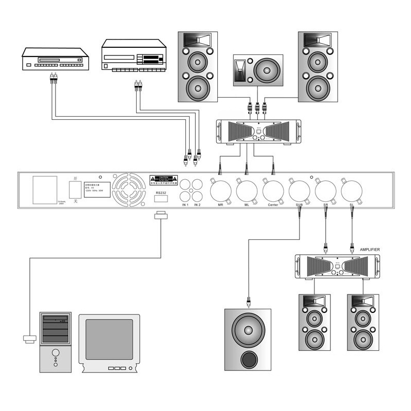 - Kết nối đầu ra: Main L/R, CENTER, SUB, SURROUND