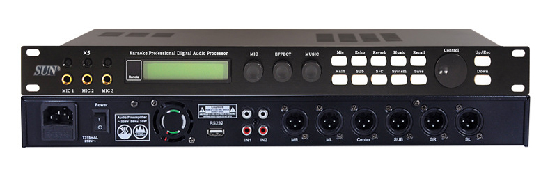 Sunaudi X5 có hiệu ứng Reverb + Echo cho âm thanh ra loa cực hay, rõ ràng và chi tiết. Cài đặt bộ chỉnh âm micrô, thiết kế giới hạn nén độc lập, thay đổi tần số 2Hz ~ 8Hz tùy chọn và kênh "Hiệu ứng TẮT" độc lập với thông lượng cao và thấp, dội lại và tiếng vang tương ứng với cân bằng tham số 5 dải (PEQ),... Vang Số Sunaudi X5 cũng được trang bị mạch chống hú cao cấp cho khả năng chống hú đến 99%, hạn chế tối đa hú rít, rè nhiễu trong quá trình ca hát. Các kênh đầu ra có chức năng tương ứng được thiết lập với cân bằng 7 tham số (PEQ), điều chỉnh thông lượng cao, tỷ lệ pha trộn, phân cực, độ trễ, giới hạn áp suất, chức năng khuếch đại.