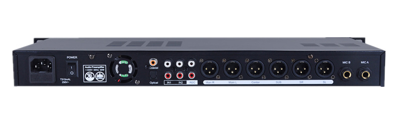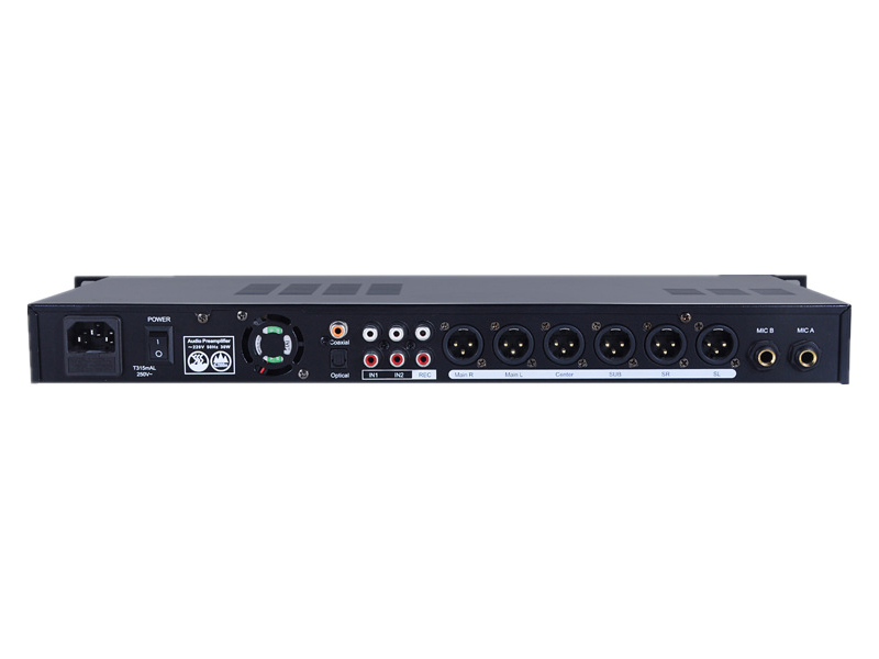 Mặt trước bao gồm các màn hình LCD, các nút chỉnh tay music, mic, effect, nút tổng control, cổng kết nối USB, 3 cổng micro 6 ly... Mặt sau bao gồm các nguồn nhạc vào RCA, coaxial, cổng quang, ngõ ra REC, ngõ kết nối nguồn điện, 4 đường tín hiệu ra loa, MR, ML, SR, SL, 1 ngõ ra Centrer, 1 ngõ ra sub, có thêm 2 đường micro ở mặt sau, công tắc tắt mở nguồn thiết bị.