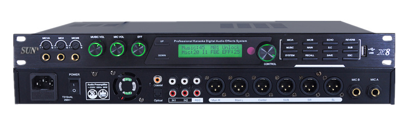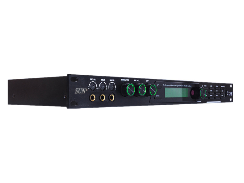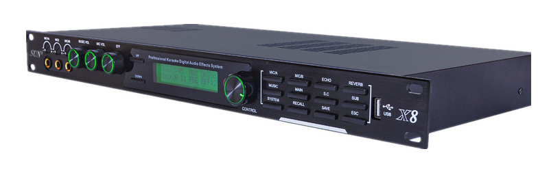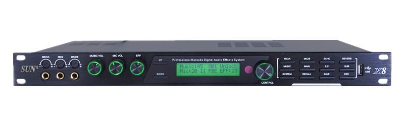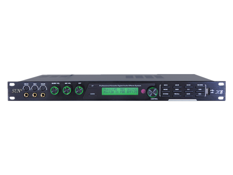 Vang Số Sunaudi X8 được trang bị bộ chip Analog Devices ADSP năm dòng ADI mới nhất, bộ xử lý DSP lõi kép tốc độ cao. Kênh âm nhạc với bộ cân bằng âm thanh stereo, hệ thống xử lý âm thanh kỹ thuật số đầy đủ có thể điều chỉnh riêng, âm thanh đa âm thanh stereo DSP, hiệu ứng âm thanh chuyên nghiệp. Sunaudi X8 có bộ điều chỉnh hiệu ứng Reverb + Echo cực hay, cho dọng hát nhẹ nhàng, bay bổng. Cài đặt bộ chỉnh âm micro, thiết kế giới hạn nén độc lập, thay đổi tần số tùy chọn và kênh "Hiệu ứng TẮT" độc lập với thông lượng cao và thấp, dội lại và tiếng vang tương ứng với cân bằng tham số 5 dải (PEQ),...
