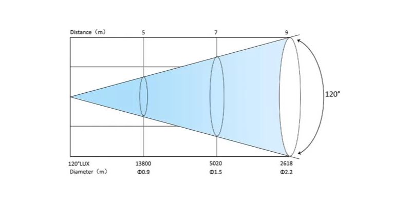 - Cường độ chiếu sáng: Độ sáng trung tâm ≥ 450Lux @30’ (9m) (120° Full ON), đường kính vùng sáng < 2.2m