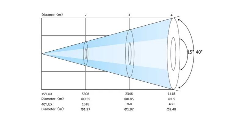 - Cường độ chiếu sáng: Độ sáng trung tâm ≥ 4300 Lux @16.4ft (5m) ở góc 15° (Full ON), đường kính vùng sáng < 1.3m
