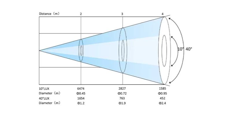 - Cường dộ chiếu sáng: Độ sáng trung tâm: ≥ 12.800 LUX @ 5m (10° Full ON), đường kính vùng chiếu < 1,1m