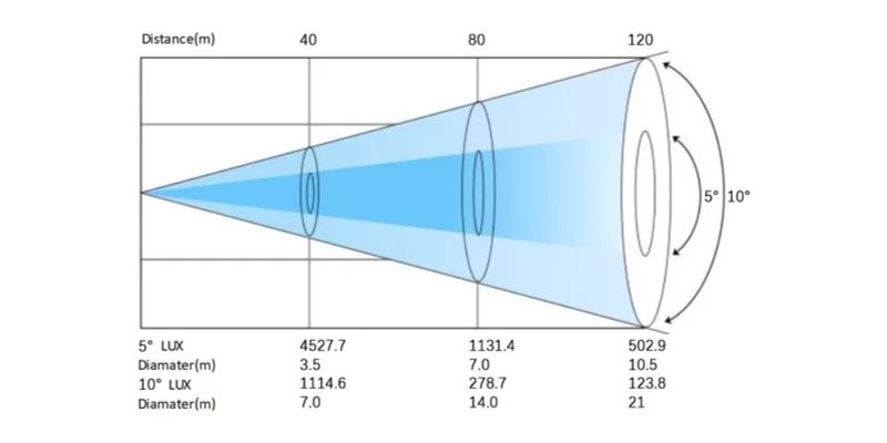 - Cường độ chiếu sáng: Độ sáng trung tâm ≥ 44.000 Lux @ 40m (131 ft) (chế độ 5° Full ON), đường kính vùng sáng < 3.5m