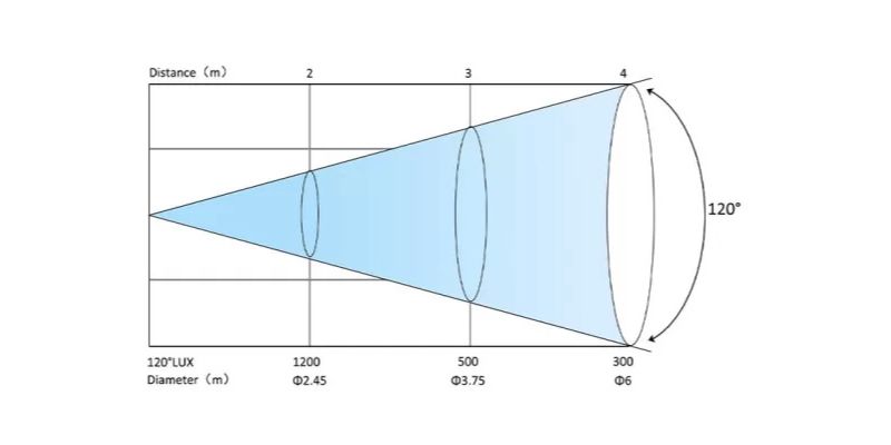 - Cường độ chiếu sáng: Độ sáng trung tâm ≥ 520LUX @13’ (4m) (120° Full ON), đường kính vùng sáng < 6.0m