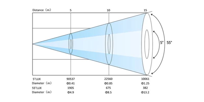 - Cường độ chiếu sáng: độ sáng trung tâm ≥ 31.000 LUX @ 15m (49,2’) (5° Full ON), đường kính vùng sáng < 1,25m
