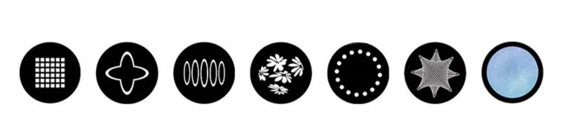 - Gobo cố định: 5 gobo cố định + Hiệu ứng sóng nước 90° + Trống