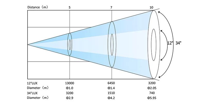 - Cường độ chiếu sáng: Độ sáng trung tâm ≥ 5200 Lux @20m (65.6’) (5° Full ON), đường kính vùng sáng < 1.5m