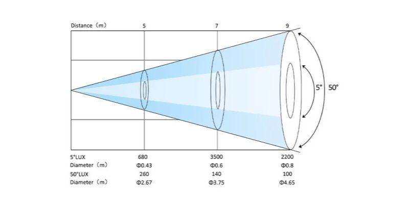 - Cường độ chiếu sáng: Độ sáng trung tâm ≥ 5800 LUX @ 9M (29,5’) (5° Full ON), đường kính vùng sáng < 1.0m