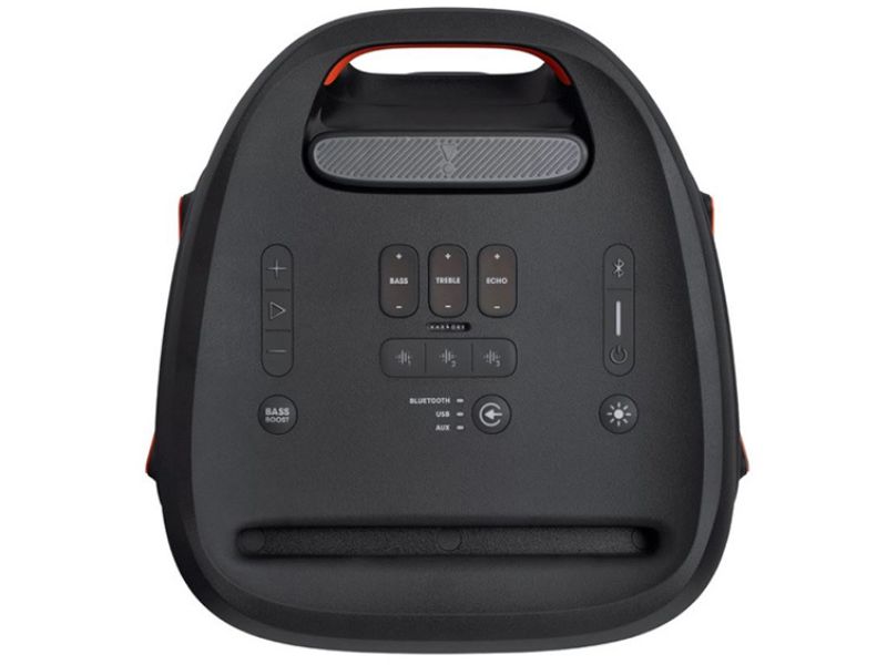 Ngoài bánh xe và tay cầm, thì bảng điều khiển chính của partybox 310 cũng có sự nâng cấp đáng kể. Bảng điều khiển trên loa đã có nắp đậy, chính vì vậy chiếc Loa Bluetooth JBL Party Box 310 sẽ có tiêu chuẩn kháng nước là IPx4. Có nghĩa là nếu loa dính chút nước hay bụi bẩn thì sẽ không phải là vấn đề khiến các bạn phải lưu tâm. Bên cạnh các nút điều khiển cơ bản giống partybox 300 như nút nguồn, bluetooth, tăng giảm âm lượng, phát dừng nhạc, nút thay đổi chế độ đèn, nút bật tắt chế độ Bass boost. Chúng ta sẽ có thêm các nút mới như thay đổi bass, treble và echo cho mic hoặc guitar, lưu ý là chỉ cho mic hoặc guitar chứ các nút này không dùng để thay đổi cái dải âm ở của nhạc, hơi tiếc 1 chút. Ngay bên dưới là 3 nút bấm nhanh các hiệu ứng âm thanh sôi động, các hiệu ứng này các bạn có thể tùy chỉnh qua app partybox của JBl luôn nha, bê dưới nữa là 1 nút dùng để thay đổi âm thanh đầu vào. Hơn thế nữa trên bảng điều khiển này tất cả các phím bấm đều có đèn nền, 1 nâng cấp rất tuyệt vời của JBL.