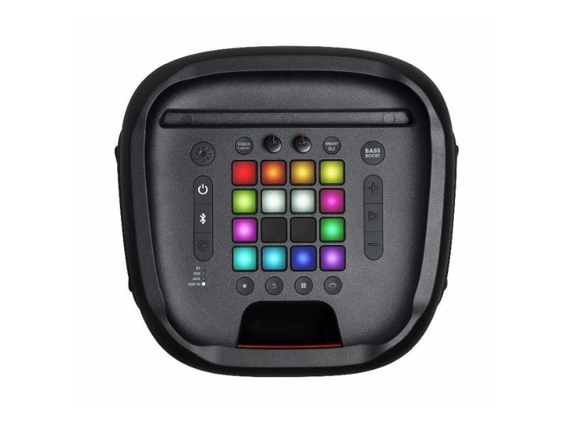 - Phía trên loa là hệ thống nút điều chỉnh để bạn có thể chơi DJ, với bộ DJ Launch-Pad 4×4