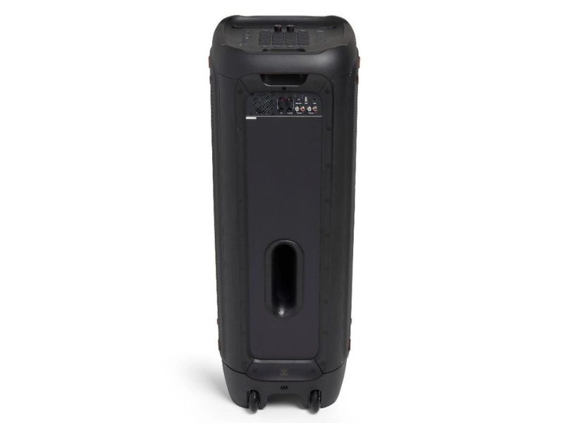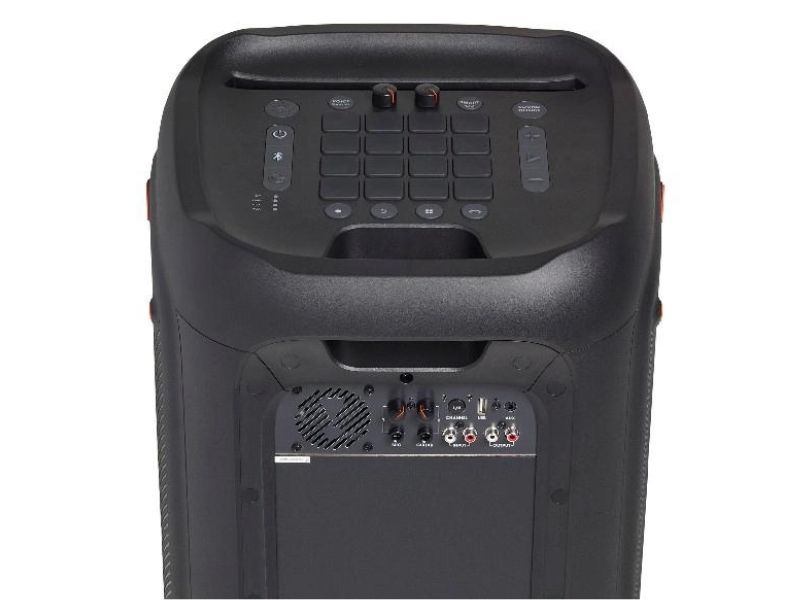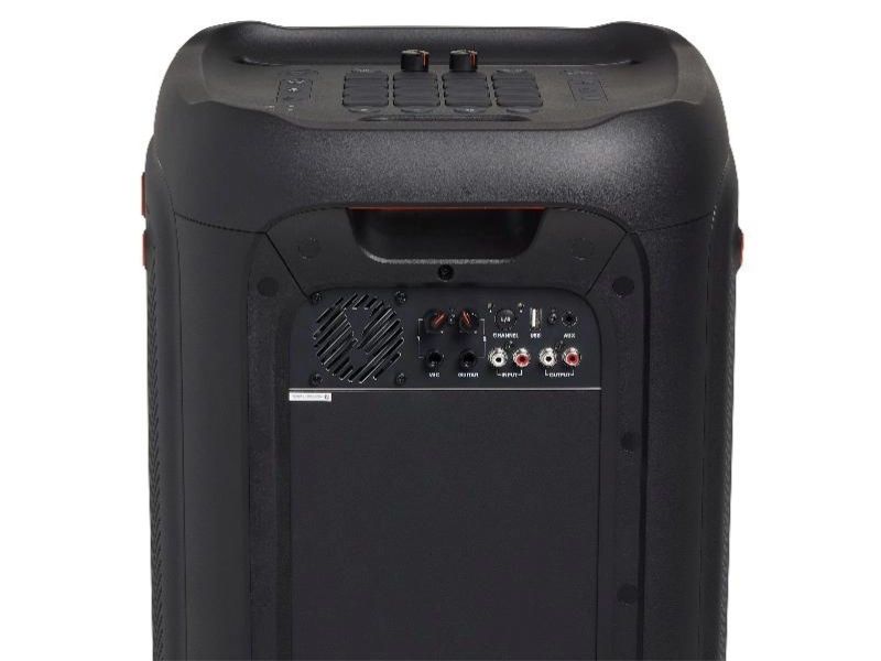 Các cổng kết nối ở mặt sau Partybox 1000 thì đều rất đầu đủ. JBL Partybox 1000 bao gồm các cổng kết nối analog (RCA và 3.5mm), có cổng USB để chơi nhạc từ USB hoặc sạc cho một thiết bị di động như điện thoại, máy tính bảng, các khe cắm mic, ghita và 2 núm tinh chỉnh âm lượng.