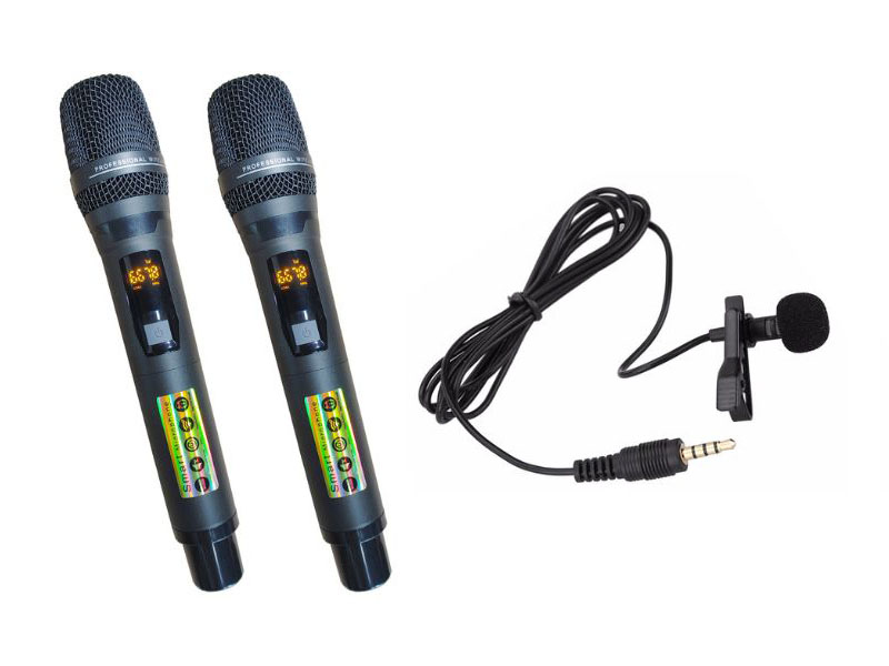- Phụ kiện: 1 x Điều khiển từ xa, 2 x Mic không dây sóng UHF điều chỉnh được tần số, 1 x Mic cài áo/đeo tai, 1 x Cáp nguồn, 1 x Sách hướng dẫn sử dụng