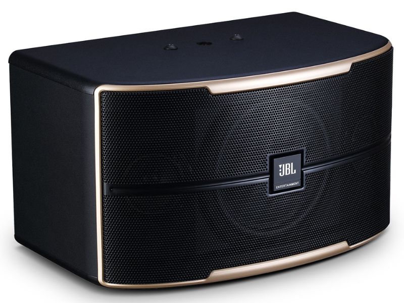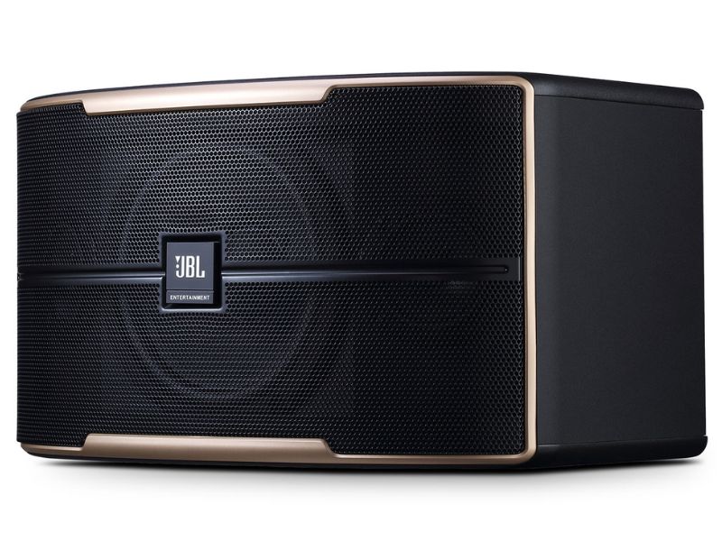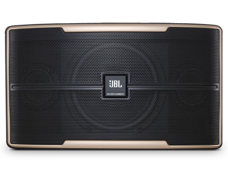 Các củ loa cùng hệ thống linh kiện được bao bọc bởi thùng gỗ MDF, phủ nhựa vinyl chắc chắn, toàn bộ bề mặt được phun sơn đen trang nhã. Mặt trước là tấm ê – căng bằng thép không gỉ cùng tone màu với thùng loa, điểm nhấn tại đây là đường viền liền mạch màu vàng sang trọng. Tương tự như các dòng loa karaoke của hãng JBL, sản phẩm được trang bị logo JBL có khả năng phát sáng khi chơi nhạc và xoay được 360 độ nên dù lắp đặt như thế nào thì logo vẫn thuận chiều.