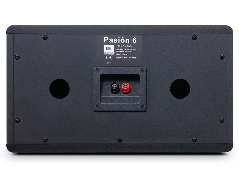 Mặt trên Loa Karaoke JBL Pasion 6-PAK được bố trí các điểm treo. Mặt sau thiết kế khá đơn giản với 2 đầu kết nối, 2 lỗ thông hơi tròn cỡ nhỏ cùng các thông số kỹ thuật cơ bản.