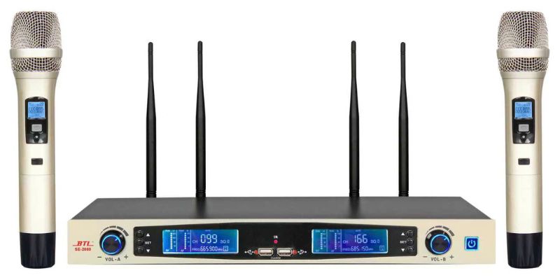 Micro Không Dây BTL SE-2080 là bộ micro không dây cao cấp đến từ thương hiệu BTL (Trung Quốc), được thiết kế dành cho các chương trình ca hát, hội nghị, sân khấu, phòng họp và sự kiện chuyên nghiệp. Sản phẩm nổi bật với khả năng thu phát sóng mạnh mẽ, âm thanh trong sáng, trung thực và hoạt động ổn định trên dải tần UHF 500-600MHz. BTL SE-2080 gồm 01 đầu thu, 04 antena và 02 micro cầm tay hợp kim nhôm chắc chắn, sang trọng, sử dụng 2 pin AA 1.5V tiện lợi. Hệ thống 4 antena giúp thu sóng ổn định, truyền tín hiệu mạnh mẽ và hạn chế mất sóng dù ở khoảng cách xa lên đến 150 mét. SE-2080 hỗ trợ chọn tần số thủ công hoặc tự động cho từng micro, với 2 x 200 kênh, khoảng cách kênh 250kHz, cho phép người dùng linh hoạt tùy chỉnh để tránh nhiễu sóng. Công nghệ dò tần số bằng hồng ngoại (IR Sync) giúp kết nối nhanh chóng, chính xác.