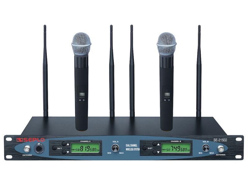 Micro Không Dây Seplo SE-21502 là dòng sản phẩm chuyên nghiệp được thiết kế dành cho các hệ thống âm thanh hội trường, sân khấu, phòng họp và sự kiện. Bộ thiết bị gồm 01 bộ thu tín hiệu (Receiver), 06 ăng-ten và 02 micro cầm tay, mang đến khả năng thu phát ổn định và linh hoạt. Seplo SE-21502 hoạt động trên băng tần UHF 720MHz - 820MHz, cho tín hiệu truyền dẫn mạnh mẽ và hạn chế nhiễu sóng. Với tần số đáp ứng 50Hz - 18kHz (±3dB) và độ nhạy -94dB ±3dB, SE-21502 tái tạo âm thanh trung thực, rõ nét, đáp ứng tốt cả giọng nói và ca hát. Khoảng cách sử dụng lên đến 50 mét giúp người dùng di chuyển tự do mà không lo mất tín hiệu.