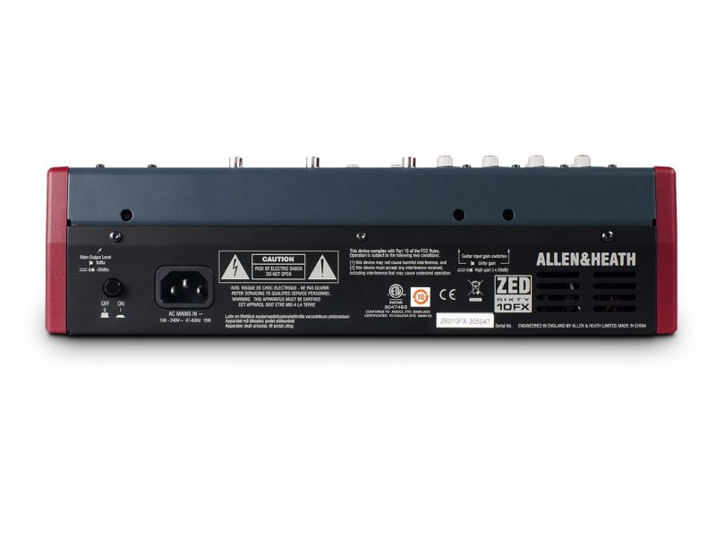 Allen & Heath ZED60-10FX là giấc mơ của các nghệ sĩ guitar. Hai trong số 4 kênh mono có đầu vào jack trở kháng cao có thể nhận mức tín hiệu đầu vào thấp từ micro đàn guitar, vì vậy đàn guitar có thể được cắm trực tiếp vào bộ trộn mà không cần đến các hộp DI. Những đầu vào này được chế tạo để tái tạo âm thanh có độ nét và sự ấm áp đáng kinh ngạc. Hai đầu vào stereo được cung cấp cho máy nghe nhạc MP3 / CD hoặc bàn phím.