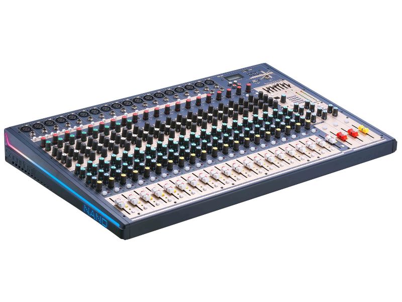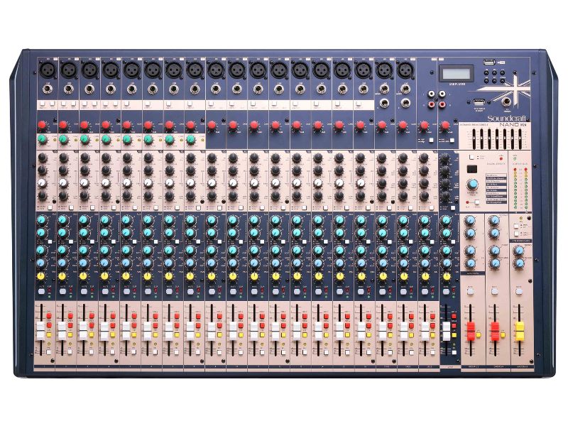 Mixer Analog Soundcraft Nano M24 cung cấp tất cả các chức năng cần thiết cho việc trộn âm trực tiếp và thu âm phòng thu: 16 kênh vào mono với bộ khuếch đại MIC tiền khuếch đại tách biệt tiếng ồn siêu thấp và nguồn điện +48V phantom; 4 kênh vào stereo; mỗi kênh vào mono được trang bị EQ 3 dải và MID có thể điều chỉnh; mỗi kênh vào stereo được trang bị EQ 4 dải; 4 điều khiển phụ trợ; đồng hồ mức ra 12 đoạn; đầu vào 2-track có thể định tuyến đến main mix, phòng điều khiển / tai nghe.