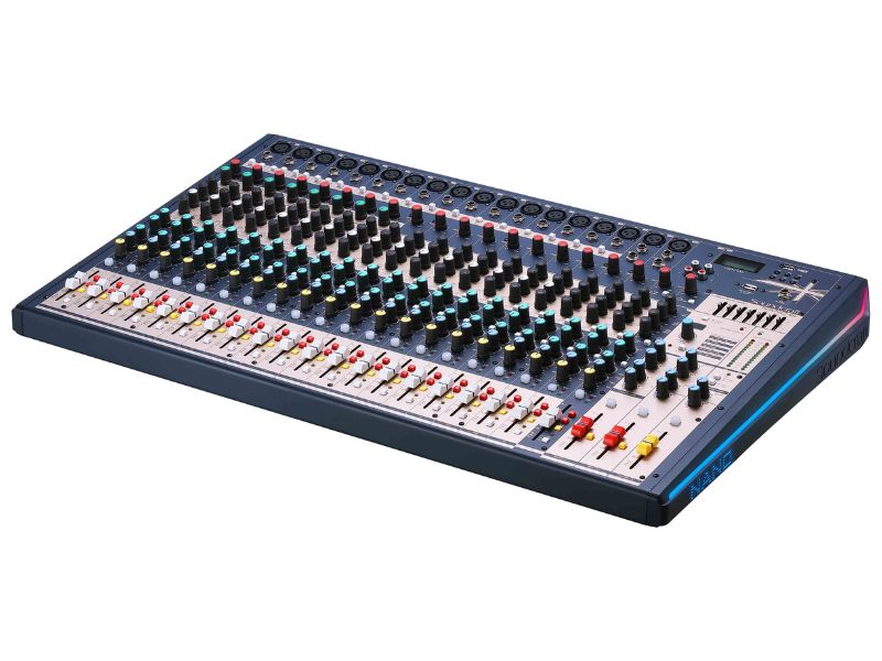 - Mỗi kênh vào stereo được trang bị EQ 4 dải và đèn LED PEAK. 8 compressor controls và 8 ngõ insert