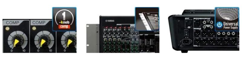 Bộ xử lý compressor 1-knob, một sáng kiến của Yamaha, đã trở thành một chức năng thông dụng trên các mixer thu gọn bởi nhiều lý do khác nhau. Những bộ xử lý compressor thông minh này có thể được sử dụng với nhiều nguồn âm khác nhau bằng chỉ một nút điều khiển, tương phản với những thiết lập phức tạp trên các thiết bị outboard. Ngoài ra, Mixer Analog Yamaha MGP24X còn được trang bị thêm một đèn LED cạnh các bộ xử lý compressor 1-knob để có thể dễ dàng kiểm tra độ compress trên từng channel.