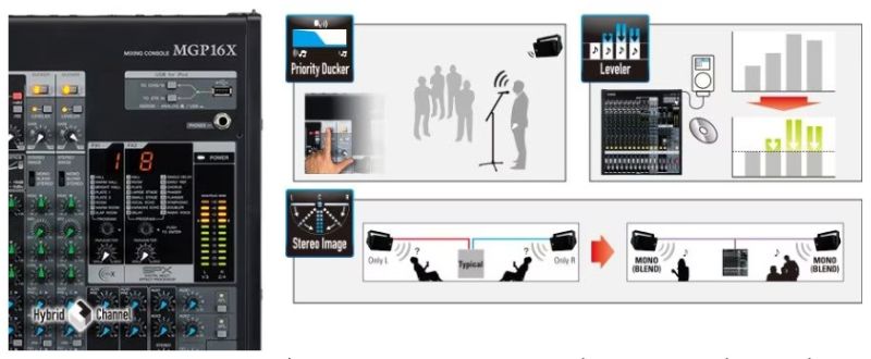 Hơn 40 năm kinh nghiệm trong việc sản xuất các mixer chuyên nghiệp đã đưa Yamaha đến một phương thức tiếp cận mới về live sound trong thời đại digital ngày nay: một kênh âm thanh stereo Hybrid. Bên dưới các nút bấm của Yamaha MGP24X là một hệ thống điều khiển digital tinh vi, kết hợp cảm giác analog truyền thống với những chức năng digital. Những mixer dòng MGP sử dụng một bộ xử lý DSP mạnh mẽ để cung cấp ba chức năng thiết yếu cho các ứng dụng lắp đặt và live sound. Để duy trì sự đơn giản kiểu analog trong thiết kế của MGP24X, mỗi một chức năng đều được trình bày các giá trị và sử dụng tại các nút điều chỉnh. Với việc trang bị một bộ xử lý EQ 3-band để điều chỉnh âm sắc và và những bộ chuyển đổi A/D và D/A chất lượng cao được tích hợp, kênh âm thanh stereo Hybrid đưa ra những chức năng độc đáo với chất lượng âm thanh vượt trội.