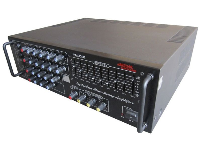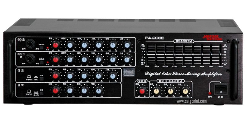 Ampli Jarguar PA 203E mang lại cho người sử dụng một cảm giác bất ngờ với công suất mạnh, âm thanh nhạc nền sắc sảo. tiếng hát thoát ra nhẹ nhàng, bay bổng, ấm áp nhưng rất trong trẻo. Jarguar PA 203E có đặc tính mà khó có dòng âm ly nào sánh nổi Với thiết kế 4 sò công suât cỡ lớn, cùng với linh kiện chất lượng cao. và nó là dòng ampli này sẽ làm bạn thật sự hài lòng với thiết kế đẹp và sắc sảo. Nếu bạn là người ưa thích Karaoke thì Ampli Jarguar Suhyoung PA 203E sẽ khiến bạn thật sự thích thú với khả năng giảm nhiễu cho Micro, tiếng hát bạn vì thế sẽ hấp dẫn hơn, nhẹ hơn. Âm thanh nhạc nền cực sạch vì đã được bộ lọc cao cấp bên trong hạn chế rất nhiều tạp âm.