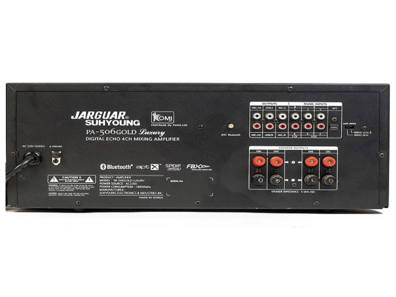Tiếp nối sự thành công của PA 506 - Series, mới đây thương hiệu âm thanh hàng đầu Hàn Quốc đã cho ra mắt mẫu sản phẩm mới Ampli Jarguar Suhyoung PA 506 Gold Luxury được cấu thành từ những linh kiện cao cấp theo chuẩn Châu Âu mang đến khả năng xử lý và khuếch đại âm thanh cực tốt, đáp ứng nhu cầu karaoke và nghe nhạc cực chất lượng.