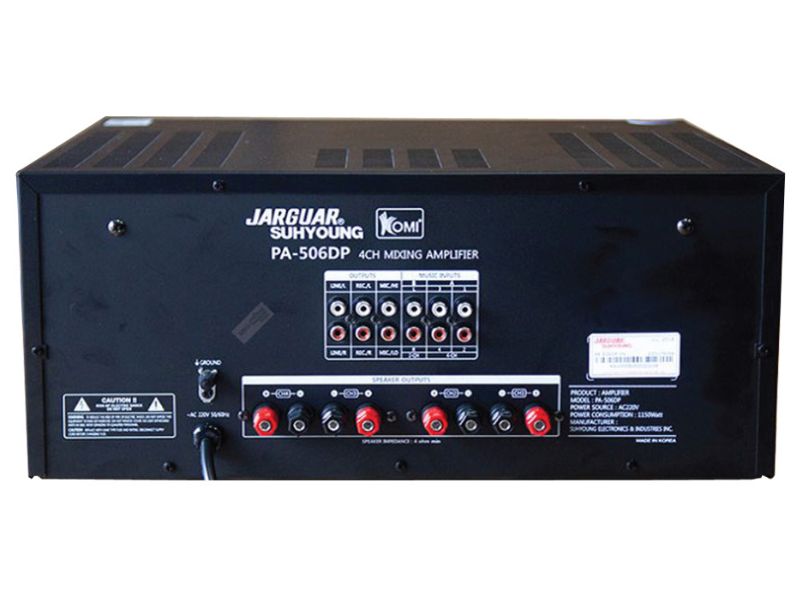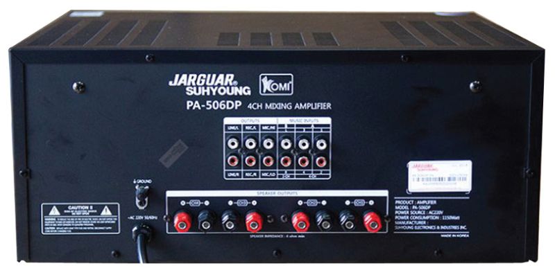 Các cổng kết nối phía sau Ampli Jarguar Suhyoung PA 506DP có chức năng được minh họa ở ngay bên dưới để khách hàng chỉ dễ dàng thao tác. Với công suất 130W/kênh thì Jarguar PA 506DP có thể kéo tới 2 cặp loa bass 20 hoặc 1 cặp bass 25 cho âm thanh căng đầy, chất lượng vượt trội. Nói chung, amply cho khả năng phối ghép tốt với nhiều thiết bị mà không có hiện tượng kén thiết bị. Ampli Jarguar PA 506DP cho chất lượng âm thanh đạt chuẩn. Sản phẩm thích hợp với những dàn karaoke gia đình, phòng kinh doanh, dễ dàng chinh phục những đôi tai khó tính bằng những âm thanh trung thực và sống động nhất.