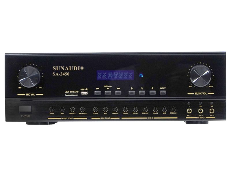 Sunaudi SA-2450 cho khả năng tái tạo âm thanh chi tiết nhờ dải tần đáp ứng rộng 20Hz - 22kHz, kết hợp chỉ số SNR >105dB và méo hài THD <0.05%, mang đến chất âm trong trẻo, trung thực và độ tĩnh rất cao. Thiết bị còn hỗ trợ 5 ngõ vào micro (jack 6ly), phù hợp cho karaoke gia đình, phòng trà, hội trường nhỏ. Về kết nối, SA-2450 cực kỳ đa dạng với Bluetooth, SD, USB, AUX, VOD, Optical, Coaxial, VIDEO IN, Remote, cùng ngõ ra PRE, SUB, MIC, VIDEO, giúp tương thích với mọi nguồn phát và thiết bị âm thanh hiện đại. Ampli cũng hỗ trợ các định dạng nhạc chất lượng cao: APE/FLAC/MAV/WMA/MP3.
