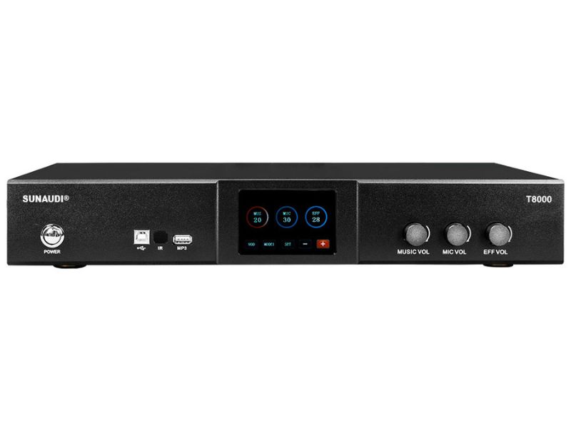 Sunaudi T-8000 còn hỗ trợ đầy đủ các chuẩn kết nối hiện đại như Bluetooth 5.0, cổng HDMI/ARC OUT kết nối TV, ba cổng HDMI input, Optical, DVD, VOD, L/R, giao diện phát MP3, USB kết nối máy tính và hồng ngoại điều khiển từ xa. Thiết bị được trang bị màn hình cảm ứng tiện lợi, dễ sử dụng cùng khả năng điều chỉnh âm lượng nhạc, hiệu ứng và micro nhanh chóng. Đặc biệt, ampli sở hữu nhiều mạch bảo vệ như khởi động mềm, chống ngắn mạch, giới hạn công suất, bảo vệ DC, cầu chì AC và cắt nhiệt, kết hợp hệ thống quạt làm mát giúp duy trì hoạt động ổn định và kéo dài tuổi thọ thiết bị. Về chất lượng âm thanh, máy đạt dải tần 20Hz - 30kHz, độ nhạy 0.5V, SNR ≥ 95dB, độ méo ≤0.2%, độ tách biệt >70dB và hệ số giảm chấn >240, đảm bảo âm thanh rõ ràng, mạnh mẽ và chi tiết. Với đầy đủ tính năng và hiệu suất vượt trội, Ampli Sunaudi T-8000 là lựa chọn lý tưởng cho mọi không gian âm thanh từ gia đình đến chuyên nghiệp.