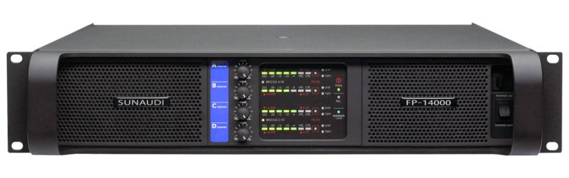 Cục Đẩy Sunaudi FP-14000 là thiết bị khuếch đại âm thanh chuyên nghiệp thuộc dòng FP Series, được thiết kế dành cho các hệ thống âm thanh sân khấu, hội trường, nhà hát và dàn line array công suất lớn. Với 4 kênh khuếch đại độc lập, FP-14000 mang đến hiệu suất vượt trội và khả năng vận hành ổn định trong mọi điều kiện hoạt động. Thiết bị cung cấp công suất mạnh mẽ với 4 x 2550W ở 8Ω và 4 x 4600W ở 4Ω, đồng thời hỗ trợ chế độ Bridge Mono lên tới 9000W, đáp ứng tốt cho các hệ thống loa full hoặc subwoofer yêu cầu năng lượng lớn. Cục đẩy có trở kháng đầu vào ≥ 20kΩ, độ chống nhiễu chế độ chung (CMR) đạt 50dB, đảm bảo tín hiệu đầu vào sạch, ổn định và ít méo nhiễu.